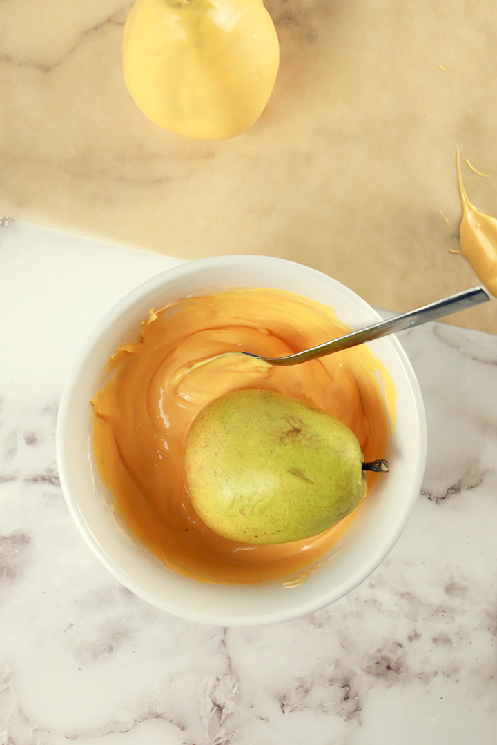 - Then hold the pear by the stem and carefully dip them into the melted chocolate. Place the pears onto a plate with parchment paper to cool. Let the chocolate set for at least 10 minutes.