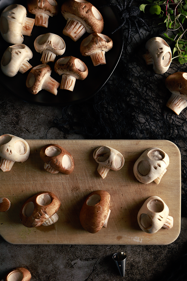 - For the skull mushrooms: You can use both white and brown mushrooms. I like the contrast of using both. You want to start by cleaning and cutting the mushrooms in half. If needed, cut down the stems to straighten the edge.